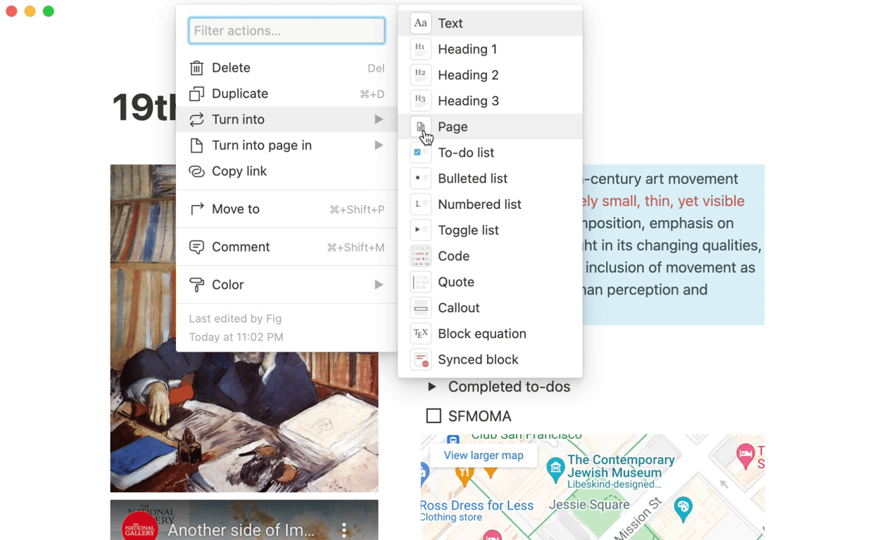 通过单击块左侧的符号 ⋮⋮ ,在弹出的菜单中,通过 Turn into 下的各种选项将块转换为其它类型!