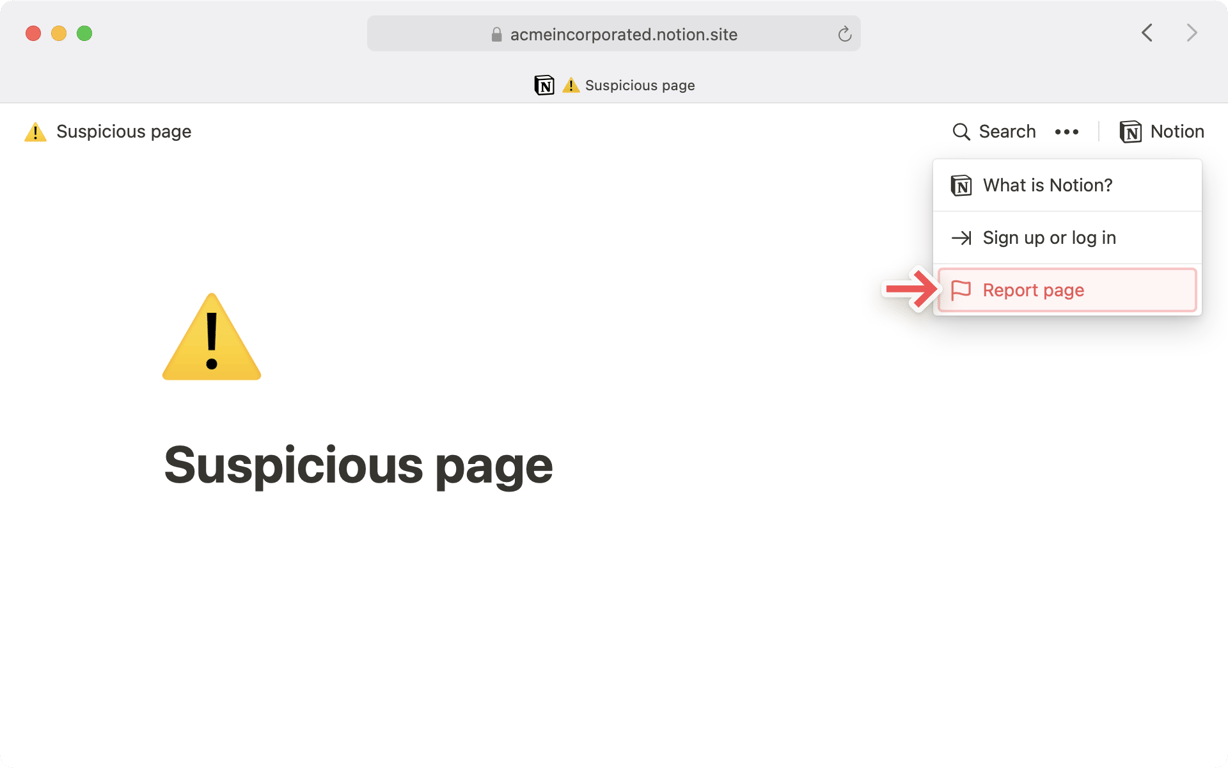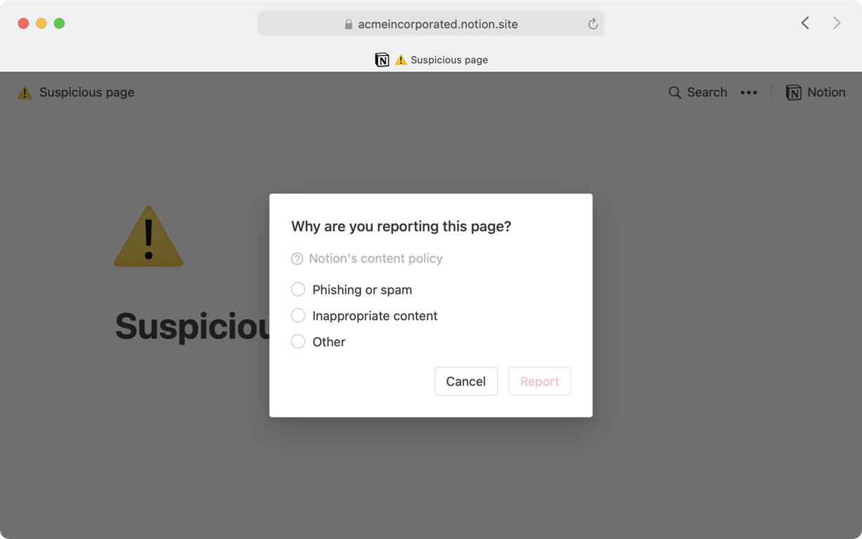 为了确保每个与 Notion 公共页面互动的人的信任和安全,我们禁止它们包含违反我们服务条款的内容。任何浏览公共页面的人都可以报告不适当的内容🚨。