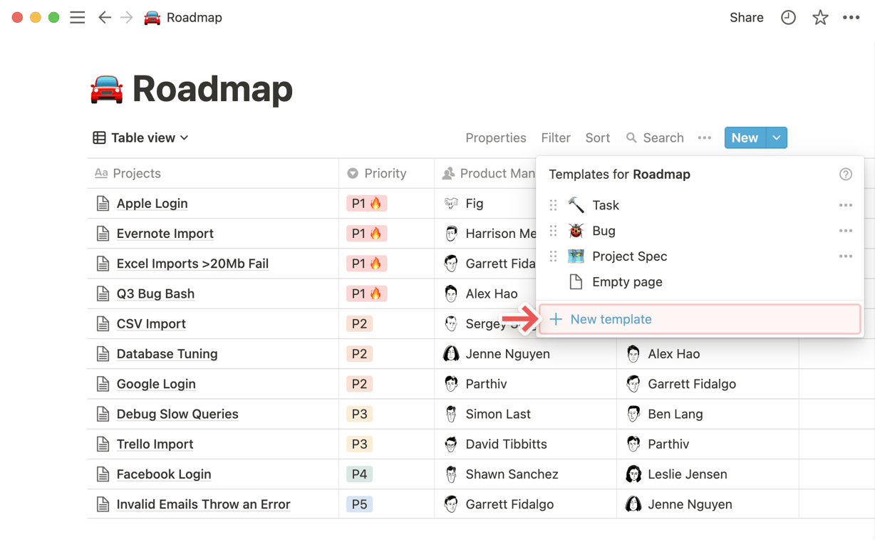 👉 注意对于数据库,将鼠标悬停在它们的顶部,可以看到`New`按钮。你也可以点击`···`并选择`模板'来创建或访问现有模板。