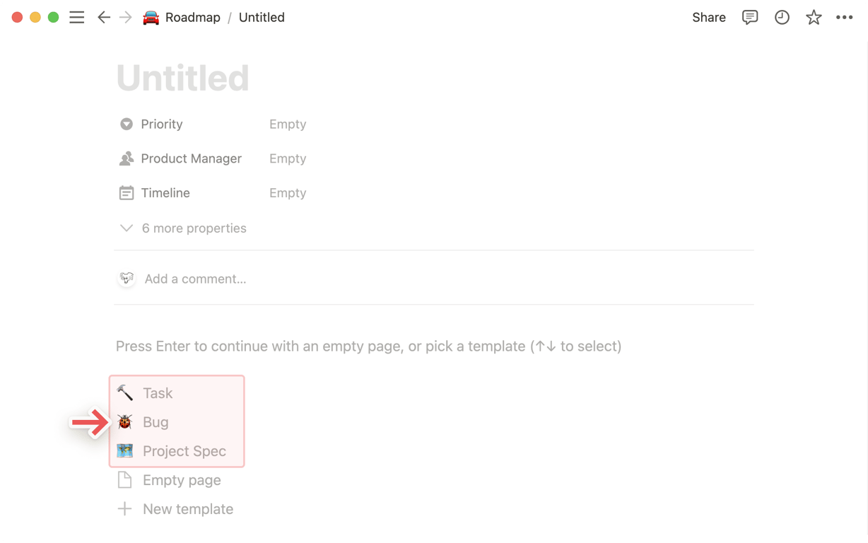 - 在你的数据库中创建一个新的页面,从它包含的灰色菜单中选择任何一个模板。