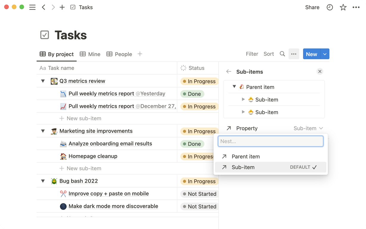 以添加子项目。您还可以拖动现有项目以将它们嵌套在其他项目下!
