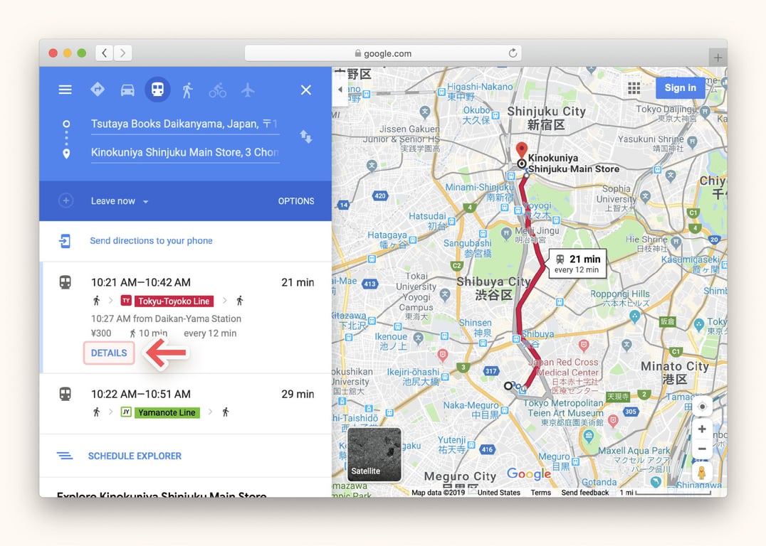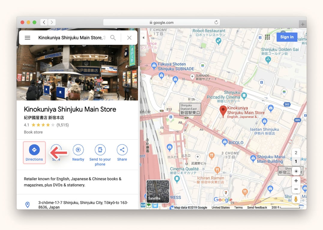- 在谷歌地图中,搜索第一个地点。点击 "方向"。