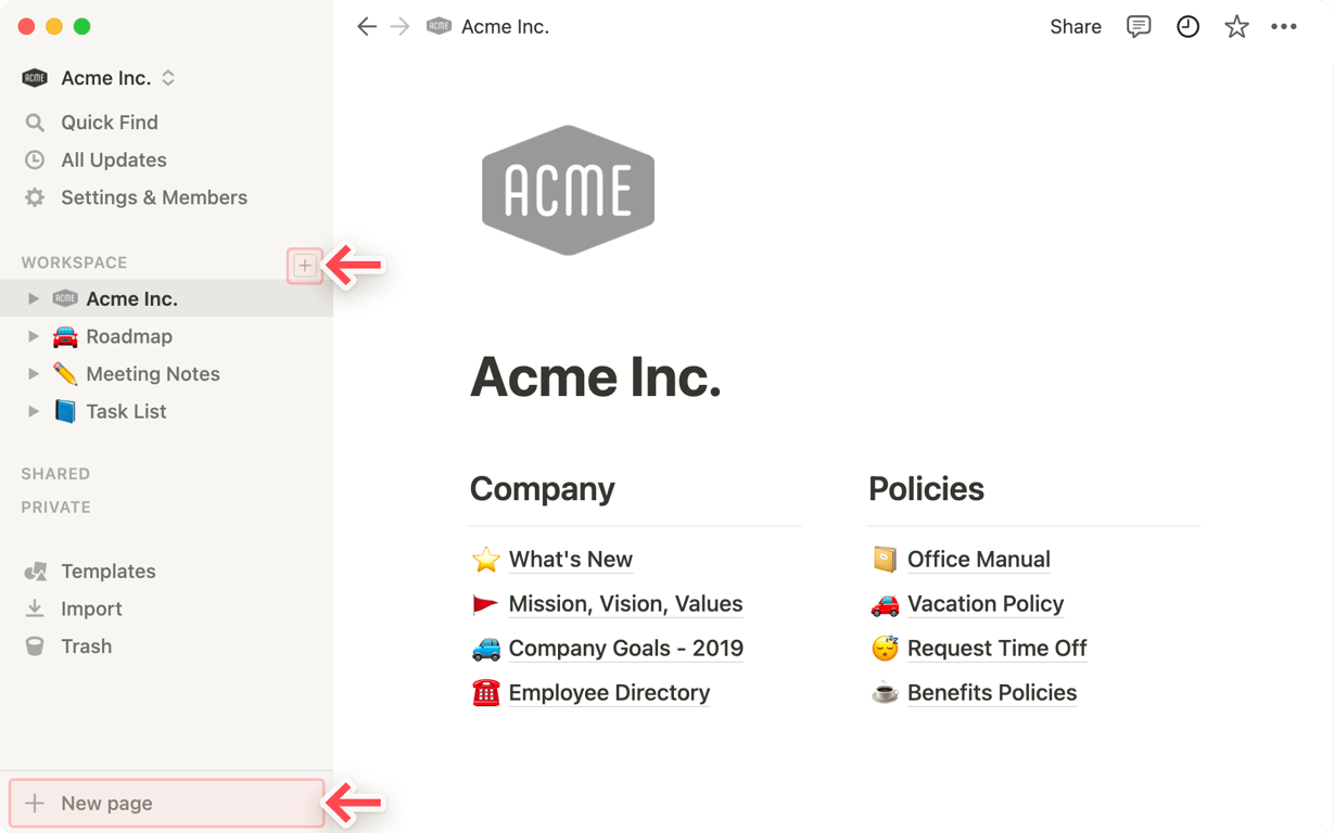 你在 Notion 中创建的每一个页面都是一个全新的画布,你可以添加任何你想要的内容。现在让我们按照下面的步骤来创建一个新页面吧。