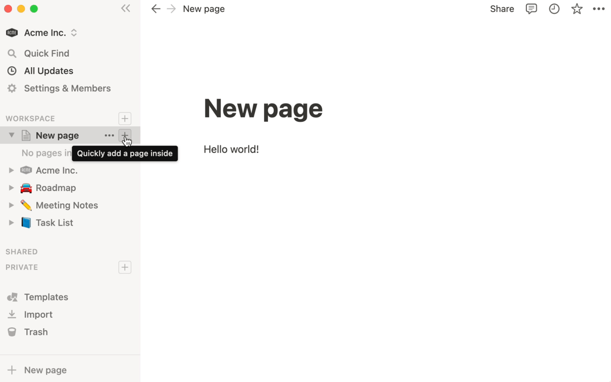 将鼠标悬停在边栏中的任何现有页面上,然后点击页面名称右侧显示的 + 按钮,这将快速在里面添加一个页面。