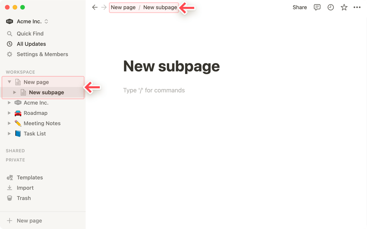 Notion 中没有文件夹。相反,您可以在页面内组织页面……在页面内。在这里,我们将向您展示如何在另一个页面中创建一个页面,我们称之为子页面 📑
