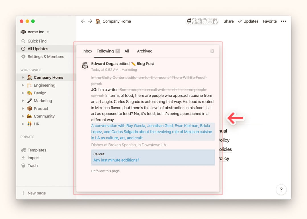 你可以在侧边栏的 All Updates 所有更新的 Following 关注部分快速取消关注页面,这样你就可以策划你的通知,使之更有针对性。